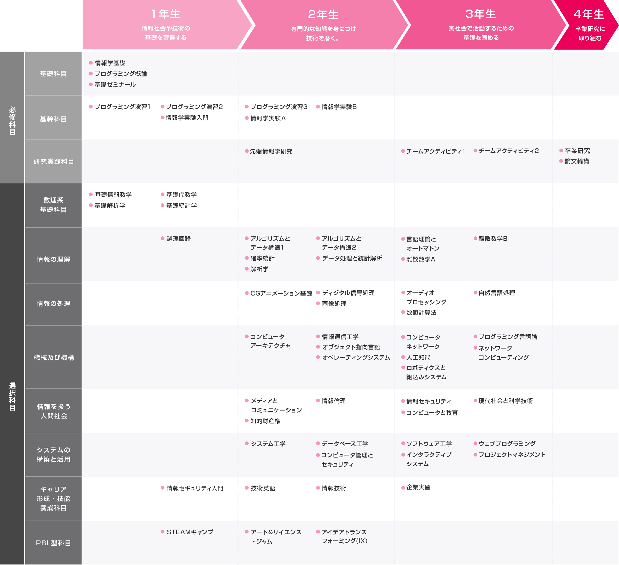 数理的・科学的・工学的・社会的な視点から物事の本質を見極め、問題解決能力を身につけられるように、情報科学・情報工学の基礎的な知識から応用技術までを幅広く学びます。